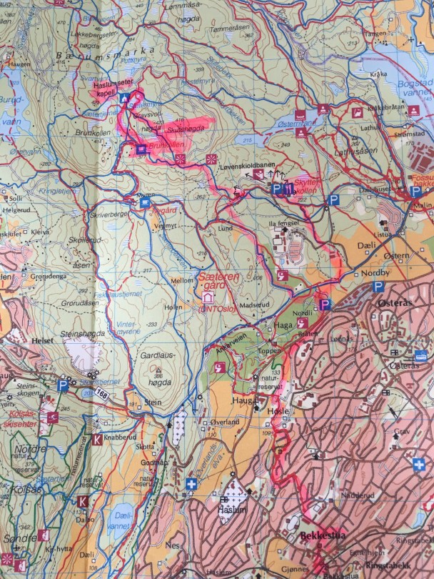 IMG_3154 July 6, 2017 3024 × 4032 Hiking to Haslumseter & Stumbling upon Snakes Here’s a snapshot of our route highlighted atop the DNT map. It looks really long, but the whole hike, including multiple photo stops and a long lunch break, took only about five hours start to finish.