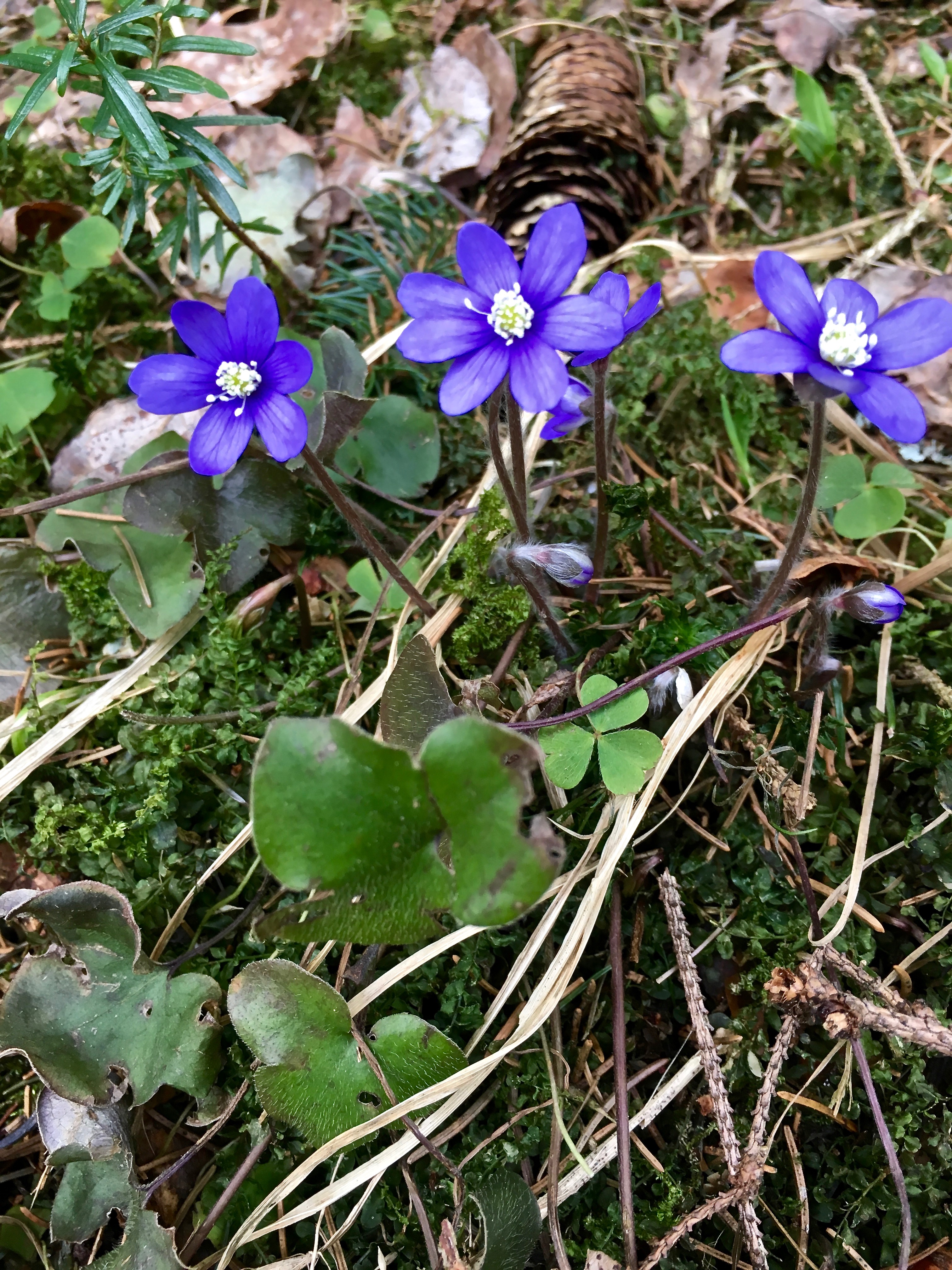 Norwegians call these flower “Blåveis” (“blue ways”) and the English common name is “blue anemone.” The official scientific name is “Hepatica nobilis,” meaning “noble liver,” because the plant’s leaves are three-lobed like a human liver. Icky name for a pretty flower, though.)