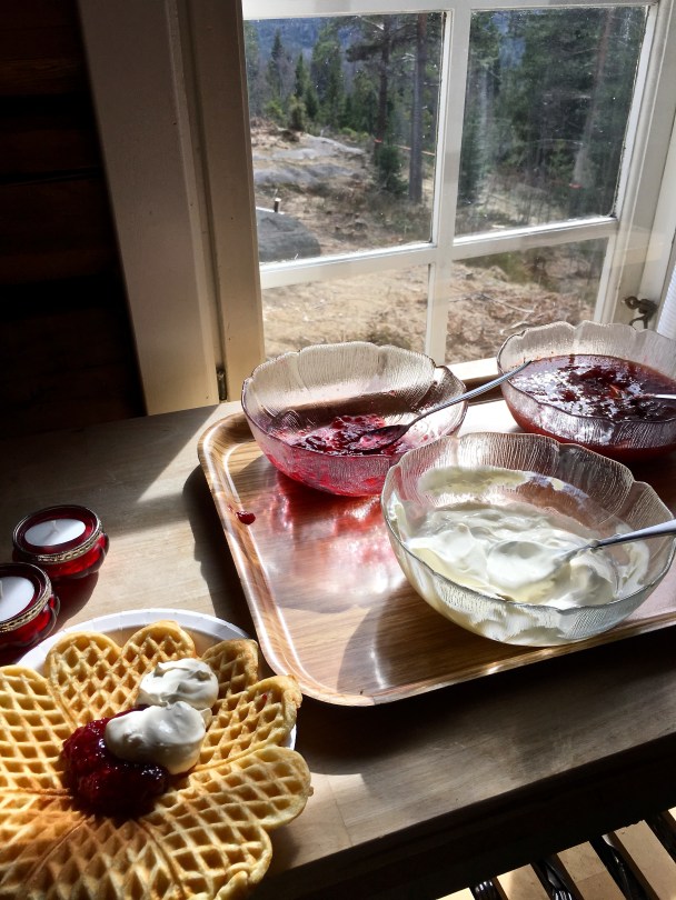 IMG_5637 July 6, 2017 3024 × 4032 Hiking to Haslumseter & Stumbling upon Snakes Norwegian waffles are typically buckwheat based. Just add a dollop of sour cream and your choice of strawberry (“jordbær”) or raspberry (“bringebær”) jam.