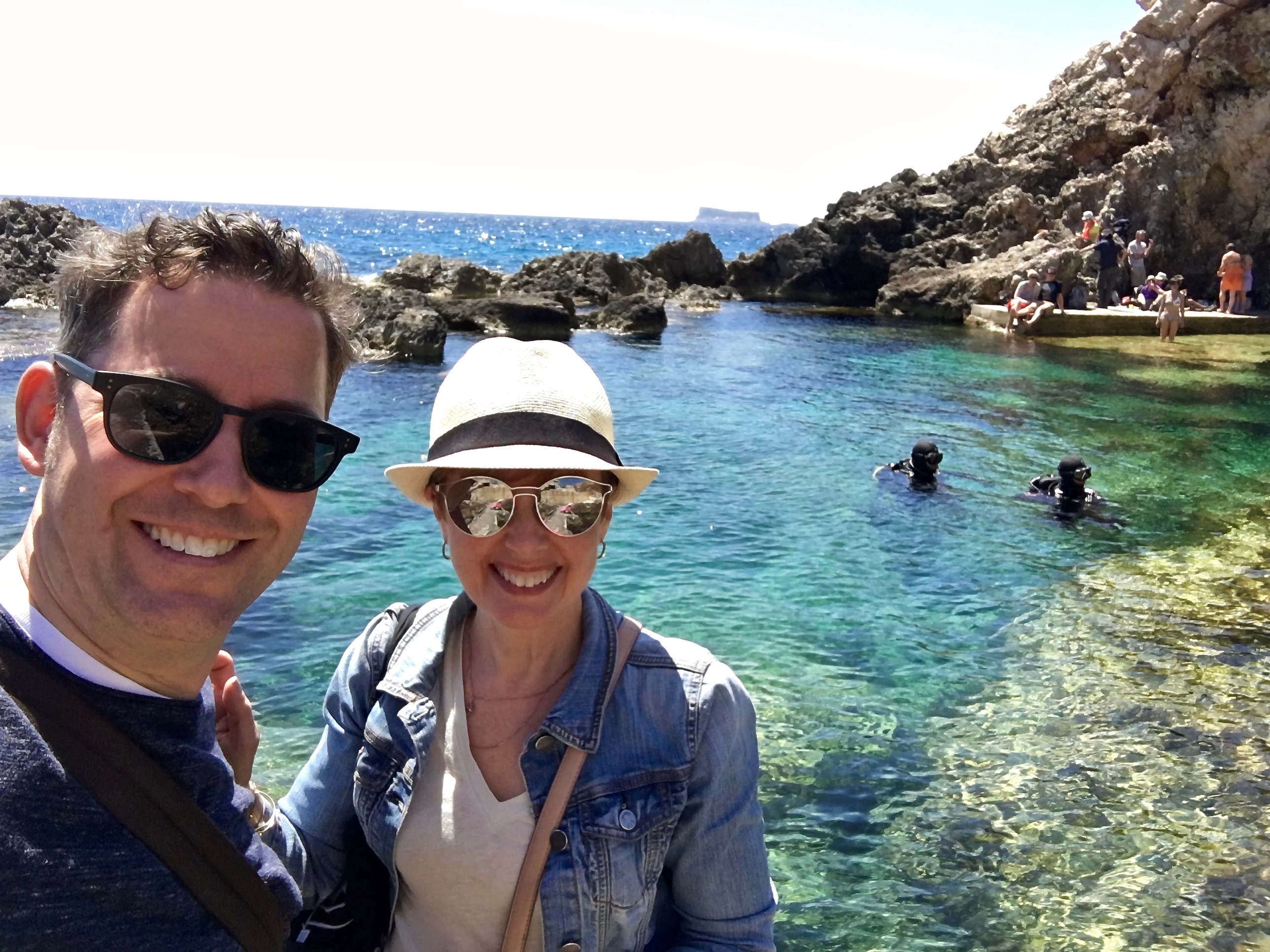 The coastline of Malta is dotted with beaches for those wanting to explore the extraordinary greenish-blue waters surrounding the island. Behind us is Ghar Lapsi, a natural “swimmin’ hole” for hard-core water enthusiasts like the divers seen here, or just plain toe-dippers.