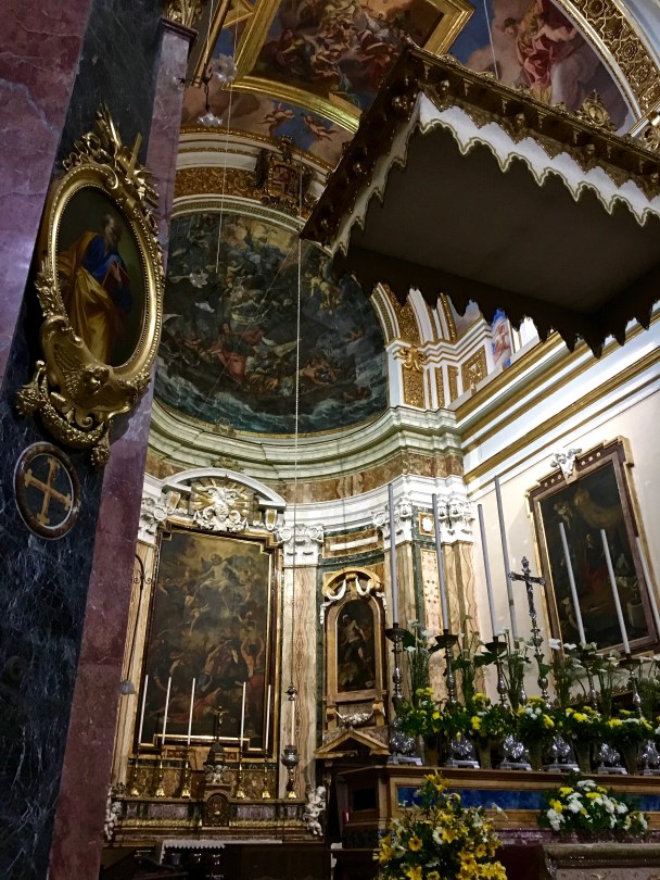 IMG_6211 August 18, 2017 3024 × 4032 Malta: Easter in a Christian Enclave The interior of St. Paul’s contains fabulous Baroque frescoes, including the one in the apse above the alter, which shows St. Paul’s shipwreck.