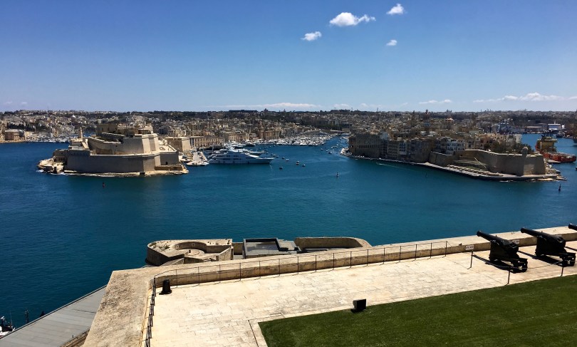 IMG_6466 August 21, 2017 4032 × 2427 Malta: Easter in a Christian Enclave From the 16th-century gun battery in Valletta, you can look across the Grand Harbor to Birgu (Vittoriosa), bracketed on the left by Fort St. Angelo and by the Il-Gardiola Watchtower and bastion on the right.