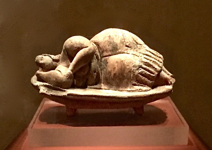 Pictured is the “Sleeping Lady,” who was found in one of the Ħal Saflieni Hypogeum burials. You can see that she bears a resemblance to the “fat folk” figurines found in Malta’s megalithic temples. She’s painted red, which some believe was the designated color of death for Maltese prehistoric people.