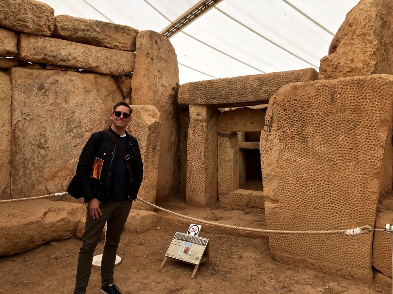 The first apse on the left-hand side of the South Temple entry contains another porthole door, which leads to a tiny cloverleaf-shaped room. Check out the incredible pitmark decoration on the stonework — the divots are drilled in horizontal rows, a little like a golfball’s surface. The Mnajdra Temples are made of coralline limestone, which is harder than the Globigerina limestone at Ħaġar Qim. It’s more difficult to carve, but details can be finer and aren’t as susceptible to being worn away by rain and climate changes.