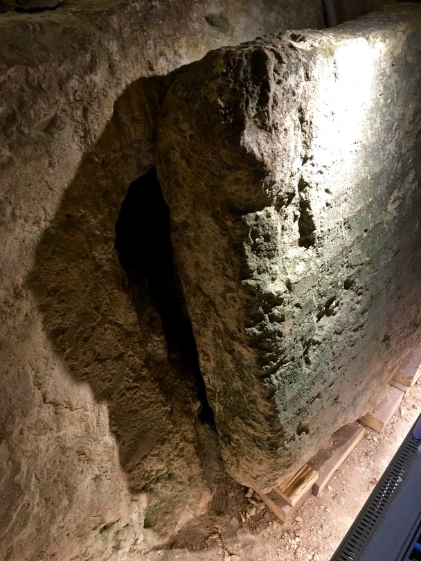 Crypts for entire families or members of a professional guild were sealed with big stones like this one. Inside, the tomb walls were lined with benches to hold the bodies. Each time a family or guild member died, the bones of a previous occupant would be bundled together into a box to make room for a new body on the bench.