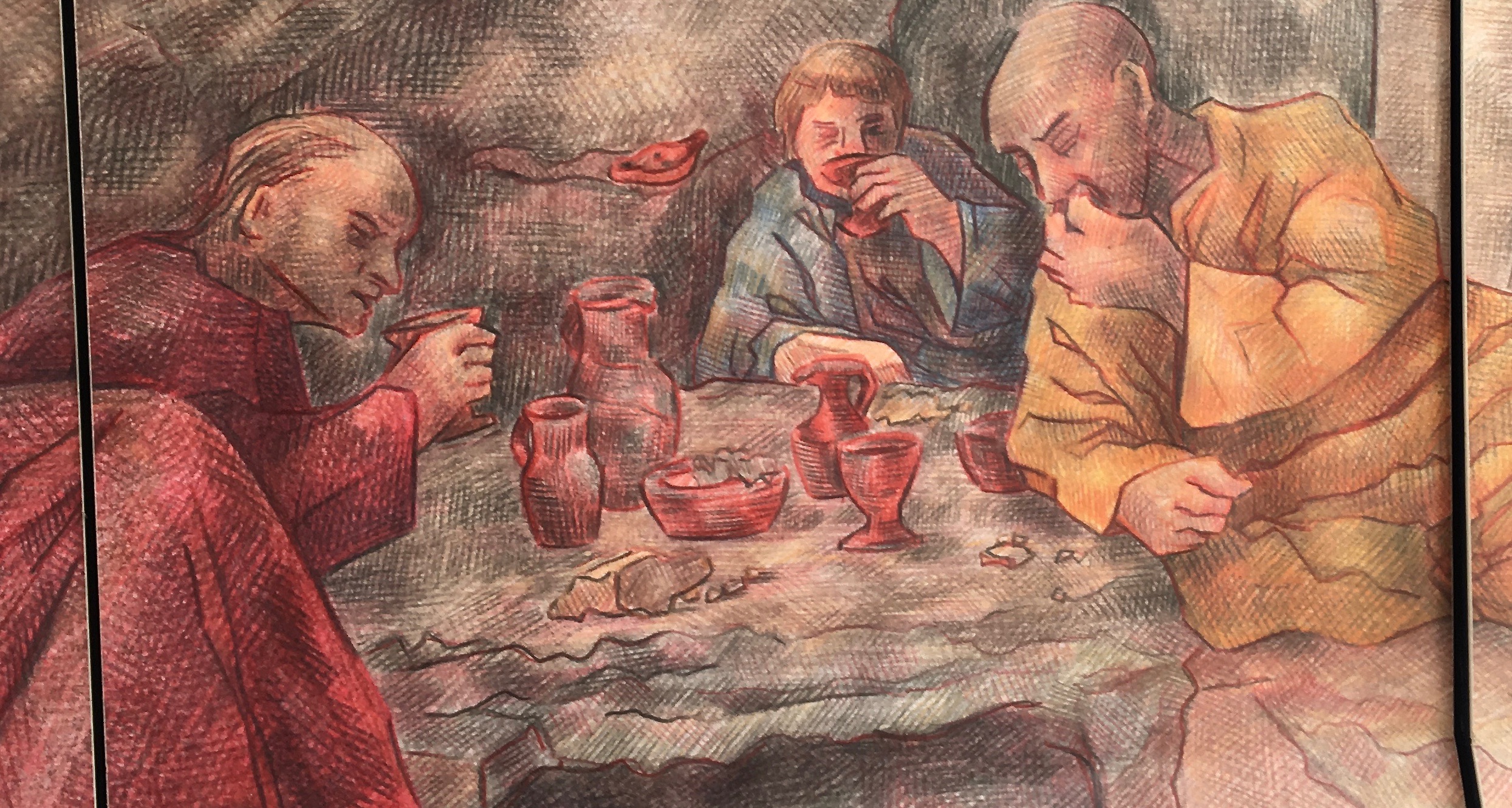 Maybe this cartoon will help you visualize the scenario better. The highest-ranking person got to sit on the right side of the triclinium, so that his right arm wouldn’t be impaired by the stone bench as much. Lying down to eat was a sign of luxury. And some think that the Romans really knew their anatomy, because lying on the left side extends the stomach so that you can eat more without feeling discomfort.