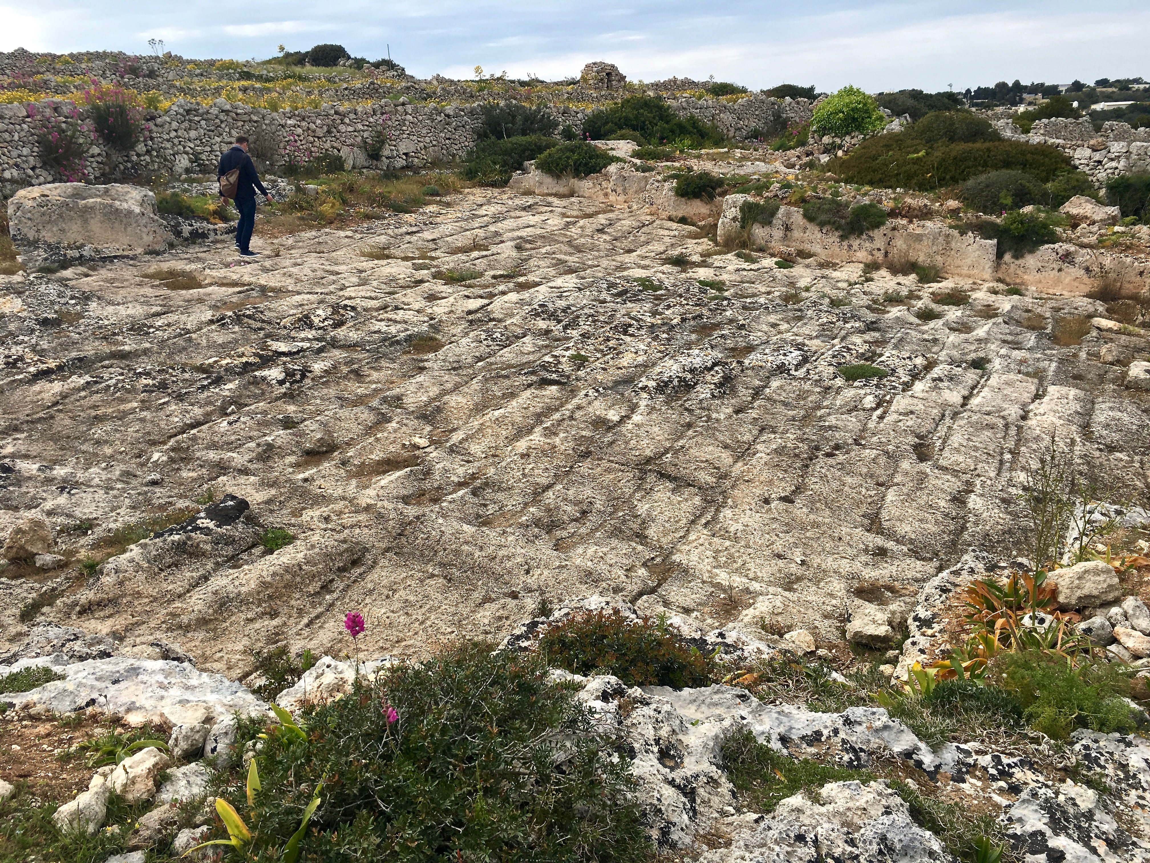 While wandering around, Matthew and I came across several old quarries. A bit of reading up later confirmed that these date from different time periods: Roman, Medieval, etc. The size of the stones excavated here seem to match the size of the blocks used in Neolithic temples. However, coralline limestone fractures naturally at joints of this size. Folks have probably been mining these same rock beds, using these same fracture planes, and reshaping the blocks to meet their architectural preferences for millennia.