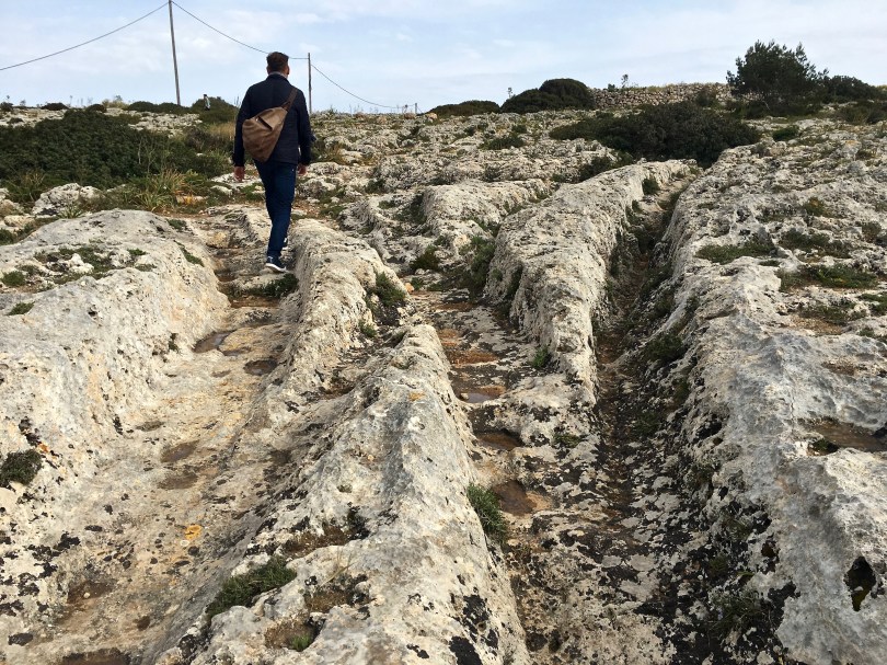 IMG_1839 August 31, 2017 4032 × 3024 Malta: Prehistoric Temples & Pagan Catacombs Matthew stands where two ruts diverge at Clapham Junction. The shape and depth of these grooves raise debates about whether they were cut by wheeled carts, runner sleds, or travois.