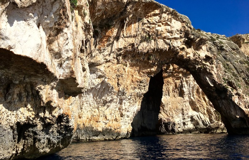 You can see one of two natural arches carved out by the action of the sea. These start as notches worn away by wave action. Weakness in the limestone allows water to break off chunks of the rock over time. These blocks continue to crash against the stone, wearing away its base until it crumbles.