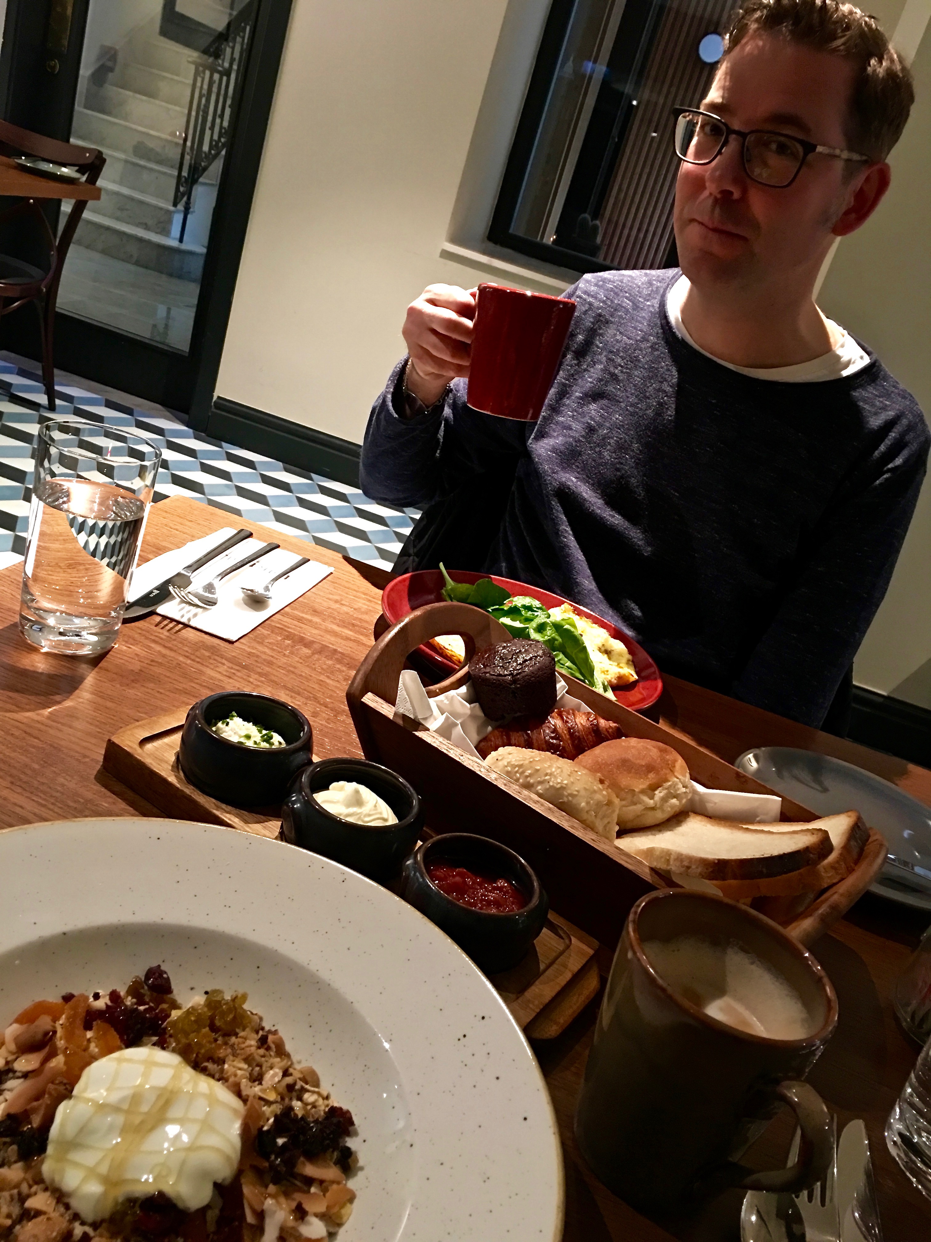 Speaking of breakfast, La Falconeria’s were awesome. Each began with a tray of assorted Maltese breads and a trio of spreads that included homemade tomato marmalade, a kind of ricotta cheese, and delicately spiced, whipped butter. Here, Matthew’s chugging his morning cuppa joe and about to dive into a delicious omelette, while I’ve opted for yogurt, fruit, and musli.