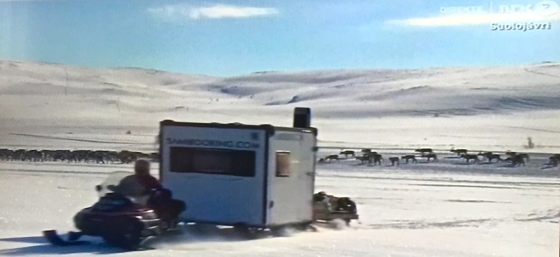 IMG_2192 October 25, 2017 3918 × 1800 The Reindeer Migration Note the Booking.com logo — how’d you like to make a reservation for a real reindeer migration experience, a stay in a Sami trailer being towed behind a snowmobile?