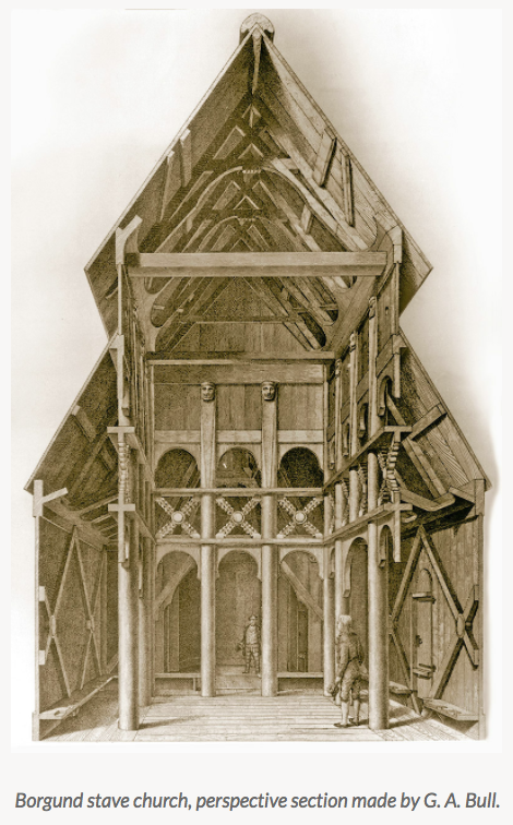 Norwegian Vikings had converted to Christianity by the mid 11th century. But they took the basic construction of their mead halls and longhouses and transferred them to their churches. Note the central aisle and side aisles of Borgund Church, supported by tall wooden pillars, called stafr (“staffs”). That’s why these structures are called Stavkirker (“Stave/Staff Churches.”) For more about this church, check out my post, “Stegastein & Stave Churches.”