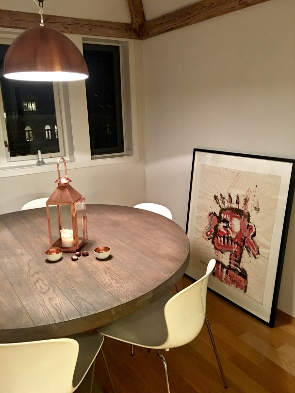 IMG_5266 November 12, 2017 3024 × 4032 The Borre Viking Mounds, Mead Hall, & More At home, our piece by Stian Borgen awaits a hook strong enough to support it, but I still think it looks awesome even sitting on the floor. His work has that same playful graffiti feel similar to Jean-Michele Basquiat’s.