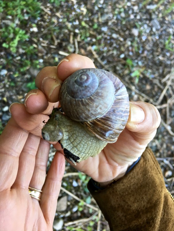 Yet another slimy friend, this one brought along his own house. He’s the kind you can eat, by the way — the Burgundy Snail (Helix pomatia) used in the French dish of escargot. He’s so cute, I feel bad about having eaten buckets of his relatives during our travels through France.