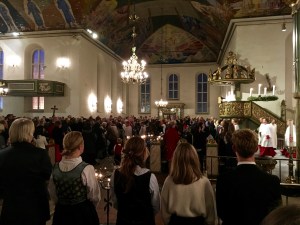The robed boys choir processes past the crowd at the Domkirke’s Christmas Eve service. Note that Norwegians often wear their national costume, called “bunad,” for special occasions.  (Click for a bigger view.)