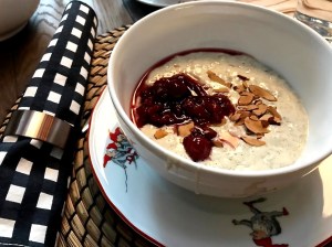 While porridge sounds boringly healthy, consider that the ingredients include white chocolate, heavy whipping cream, and a compote topping of dried cherries with toasted almonds.