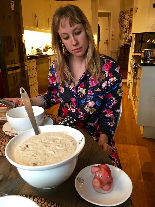 My sister Ruthie eyes the porridge and pig somewhat suspiciously. The porridge turned out to be a hit, but the marzipan, not so much. I’m crazy for the stuff, but it seems like marzipan must be an acquired taste. It has a slight bitterness to its almond flavor and isn’t so sugary sweet as most American treats.
