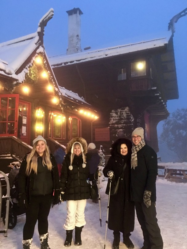 If you want to take a stab at the sled run but have family members that aren’t really up for it. They’ll enjoy sitting by the fireside at the fabulous dragon-style Frognerseteren. In winter for the downhill trek to restaurant and sled rental, those who are unsteady on their feet will benefit by using walking sticks and crampons, like my mom is doing here.