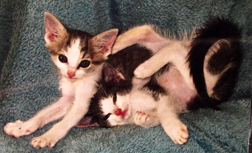This photo taken the day after we found them totally reveals their personalities. Jess, the ladylike flower, and Nick the silly goofball. We found out from the vet that the third kitten had been rescued and adopted by another neighbor the day before.