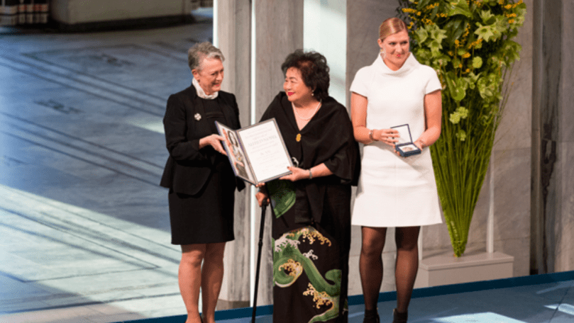 Screen Shot 2018-03-16 at 6.43.29 PM March 16, 2018 1206 × 680 2017 Nobel Peace Prize ICAN spokesperson Setsuko Thurlow and ICAN Director Beatrice Fihne receive the Nobel Peace Prize in Oslo City Hall.