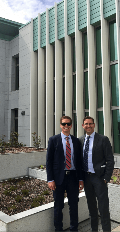 Matthew and coworker Dan stand on the terrace outside the commissary. The fins on the windows help to reduce summer heat gain and minimize the glare bouncing off of the snow in winter. But having lots of natural light plays a key role both in energy savings and in combatting SAD (seasonal affective disorder), which is common in Scandinavia.