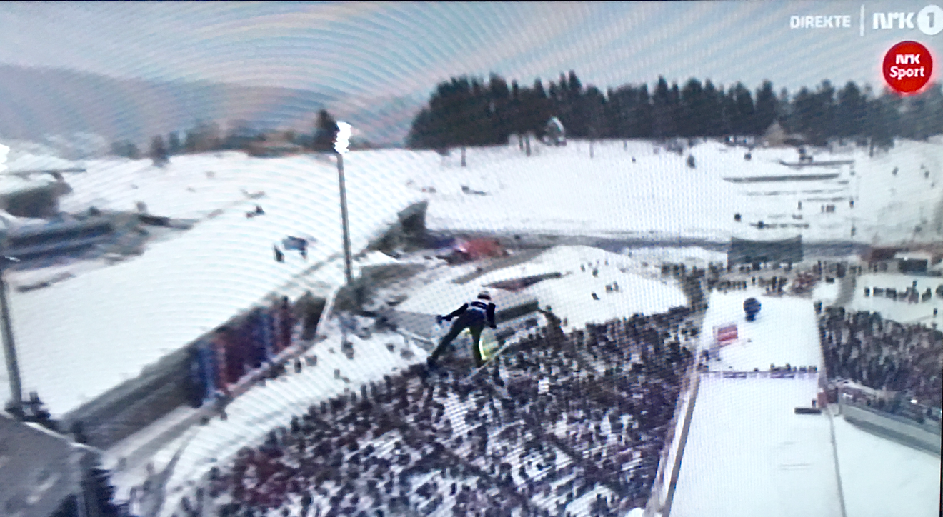 Pardon my bad photo, but I think I probably saw more action on T.V. than I would have seen had I made it to the crowded event in time. You can see why jumps from Holmenkollen are called “ski flying” as opposed to “ski jumping.” (Can you pick out the skier seemingly hovering helicopter-like above the stadium? Click for a bigger view.) The hill is bigger and the distances jumped are much longer, often more than 135 meters (442 feet.)
