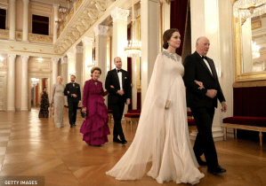 Norwegian King Harald escorts a resplendent Kate, whose baby bump is sheathed in Alexander McQueen, to dinner at the Royal Palace in Oslo. Queen Sonja follows on Prince William’s arm. Crown Prince Haakon and Crown Princess Mette-Marit are next in line, with Princess Märtha Louise bringing up the rear.  (Click for bigger view.)
