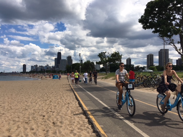 Pretty much the entire lakefront is strewn with beaches. Some are quite narrow and close to the roadway, but others are broad and far away from the traffic on Lake Shore Drive. You can rent Divvy bicycles (the blue ones in the foreground, $10 for 24 hours) at several spots scattered all over the city and ride along the lakefront to any of the many, many beaches. The city is currently creating a second path so that bicyclists have a separate trail from the runners, dog walkers, and meanderers.