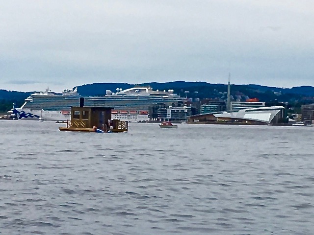 I love the juxtaposition of the Beverly Hillbilly-style floating sauna in the foreground, with the city-sized cruise ship in the background. The building on the right, with the swooped roofline, is the Astrup-Fearnley Museum of Modern Art, another great tourist destination.