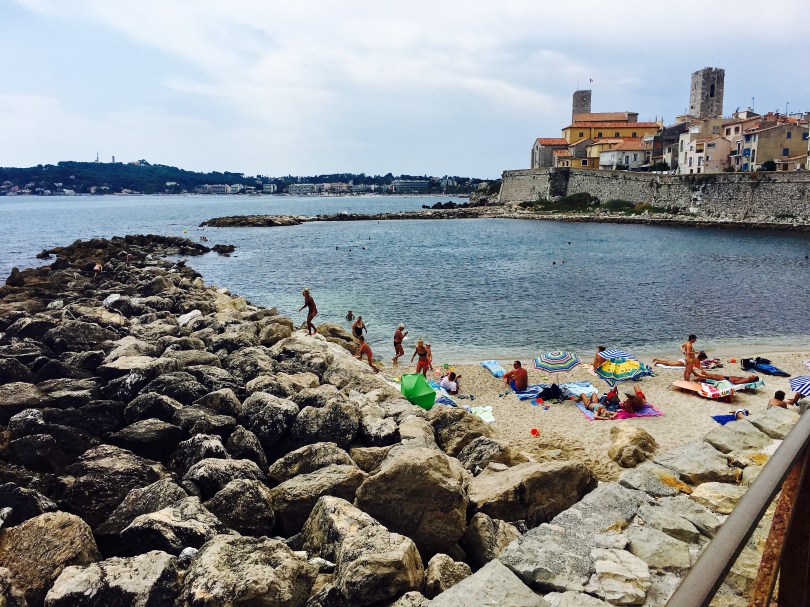 Pictured is a beautiful little public beach in Antibes, with “Vielle Ville” (Old Town) in the background. There are tons more gorgeous sandy beaches strewn all along Antibes shoreline, which is rare for the typically rock-strewn coastline of the French Riviera.