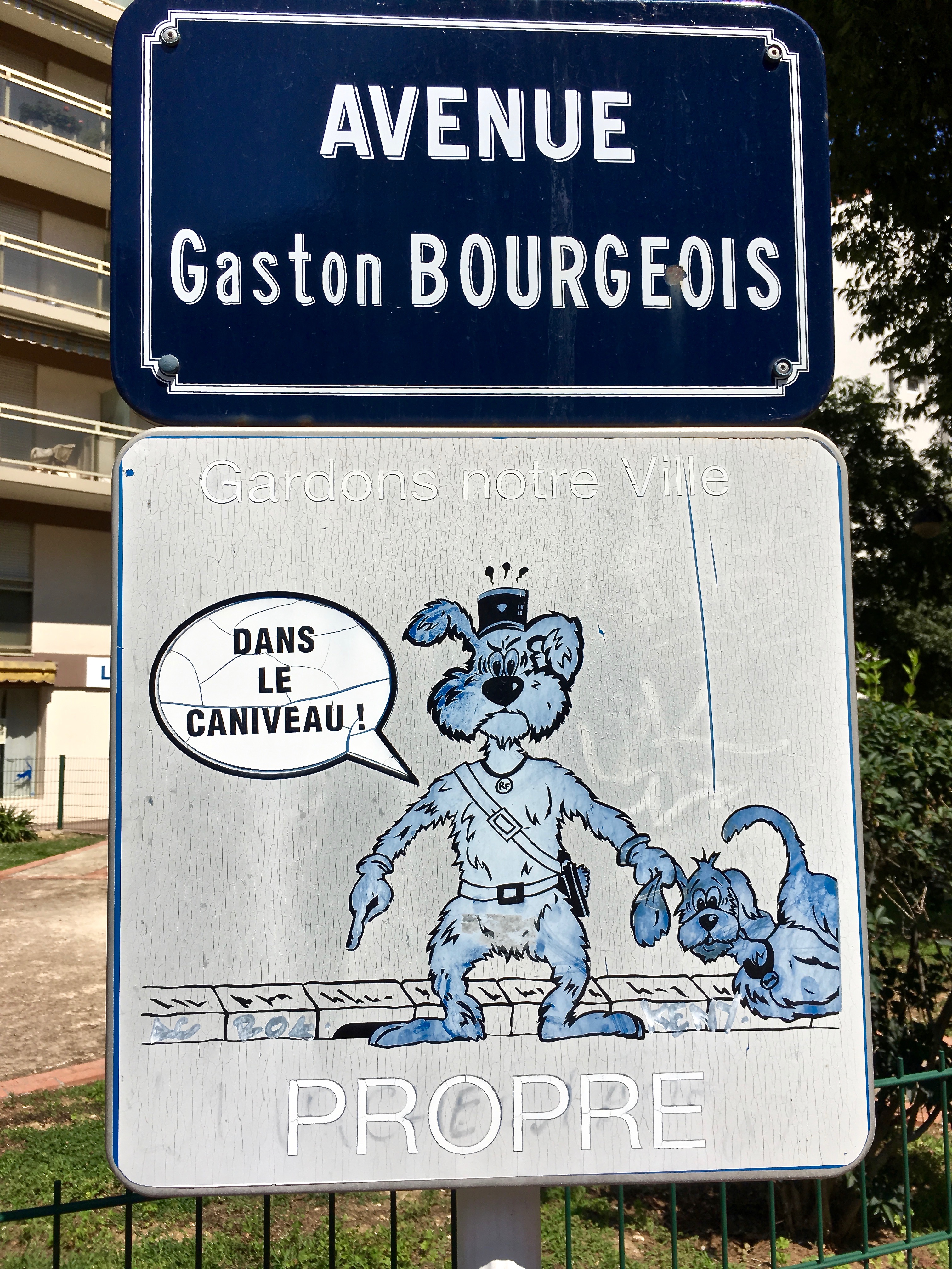 We all know how much the French supposedly like their small dogs. Here we have a canine Gendarme telling another puppy, “pee in the gutter, pal!” similar to the U.S. “curb your dog” signs. The surrounding verbiage reminds pet owners to “keep our city clean.”