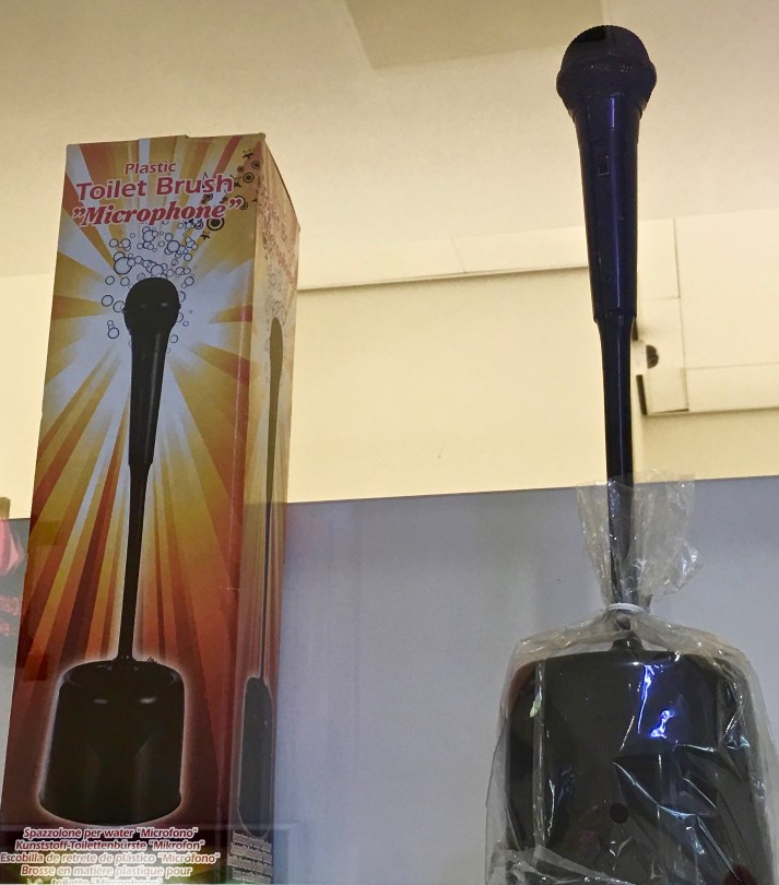 IMG_8993 October 19, 2018 2537 × 2883 Antibes: Fun for Francophiles & Francophobes Next to the public toilet is a store specializing in all kinds of toilet accoutrement, such as this toilet-brush-slash-microphone. Might as well entertain yourself while coppin’ a squat.