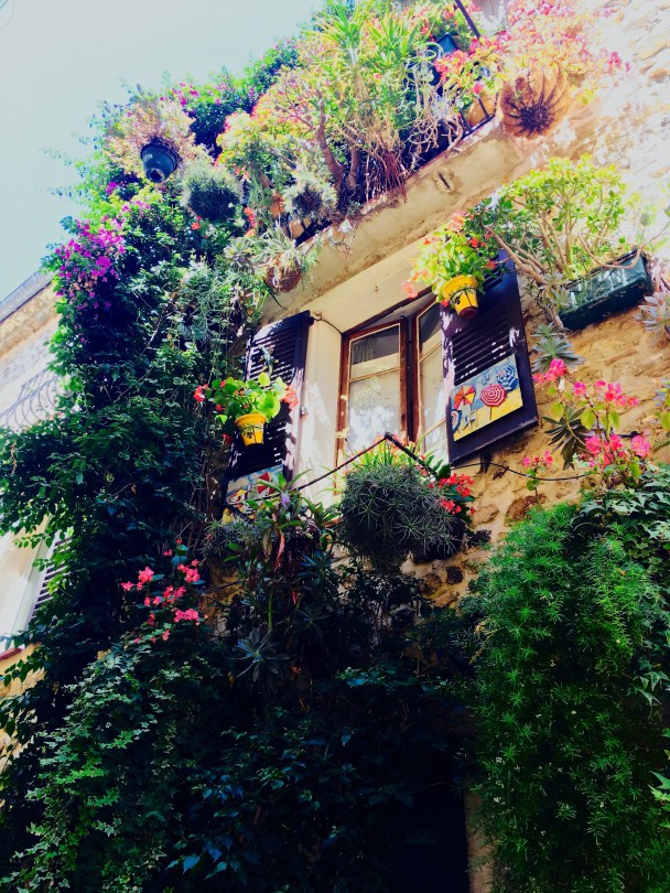 IMG_3865 October 25, 2018 3024 × 4032 Ancient Antibes …And then there are the flowers. Safranier’s residents tuck pots of plants in every available niche. Antibes has a dry Mediterranean climate, so you’ll find lots of flowering cactus and other drought-tolerant species here.
