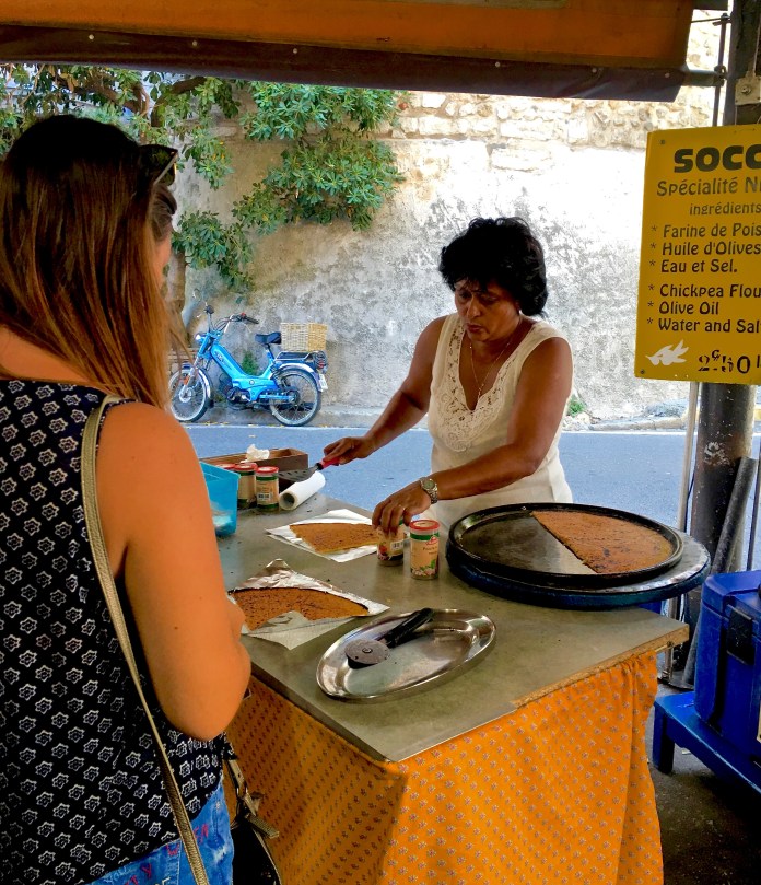 A local specialty is “socca,” a flat pancake made of chickpea meal, olive oil, and spices. Super delish and not to be missed! The Marché Provençal has a regular vendor who sets up camp in the southeast corner with a portable furnace / pizza oven. The pancake is then baked via a wood fire and served off the metal pan you see here.