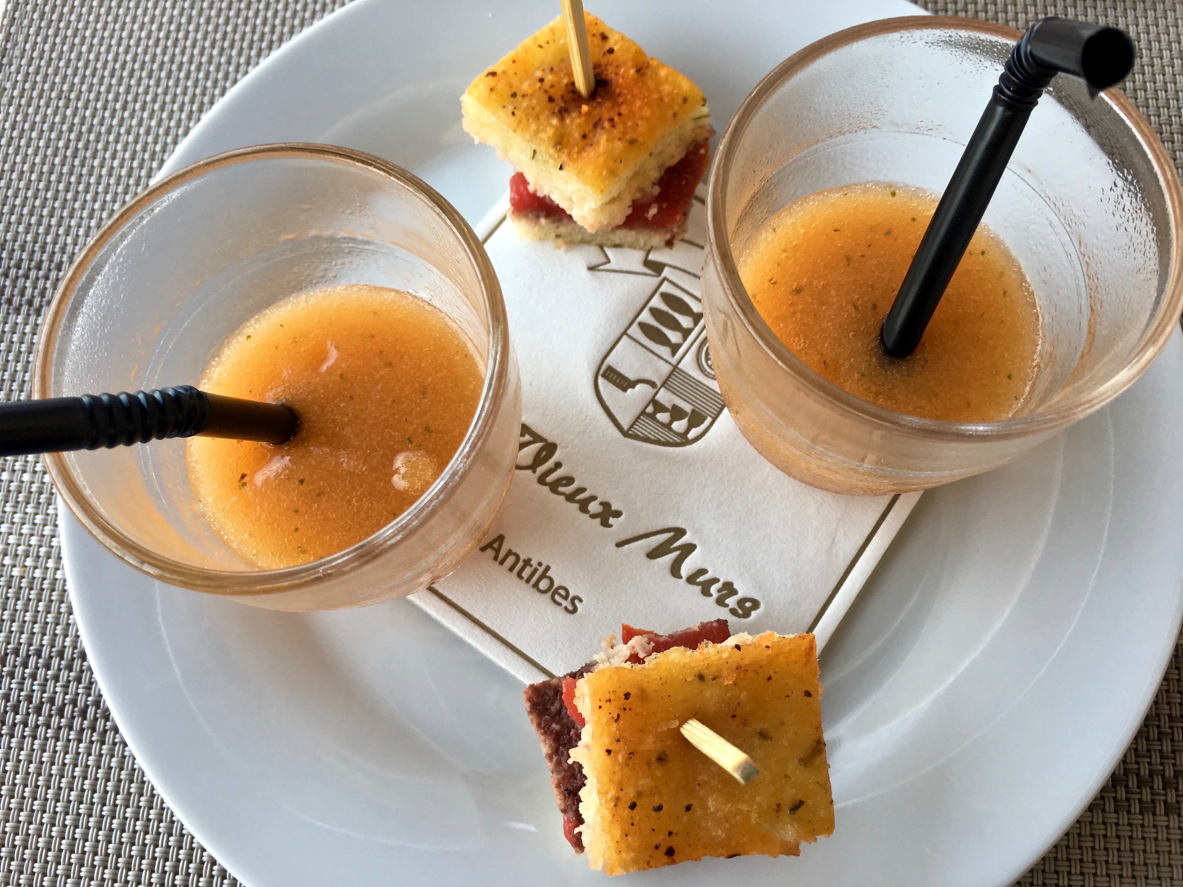 IMG_7494 October 30, 2018 4032 × 3024 Ancient Antibes Behold, our fabulous appetizer of melon soup with red-pepper ciabatta.