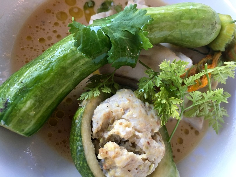 IMG_7500 October 30, 2018 4032 × 3024 Ancient Antibes My meal of zucchini stuffed with seafood, all floating in shellfish broth.