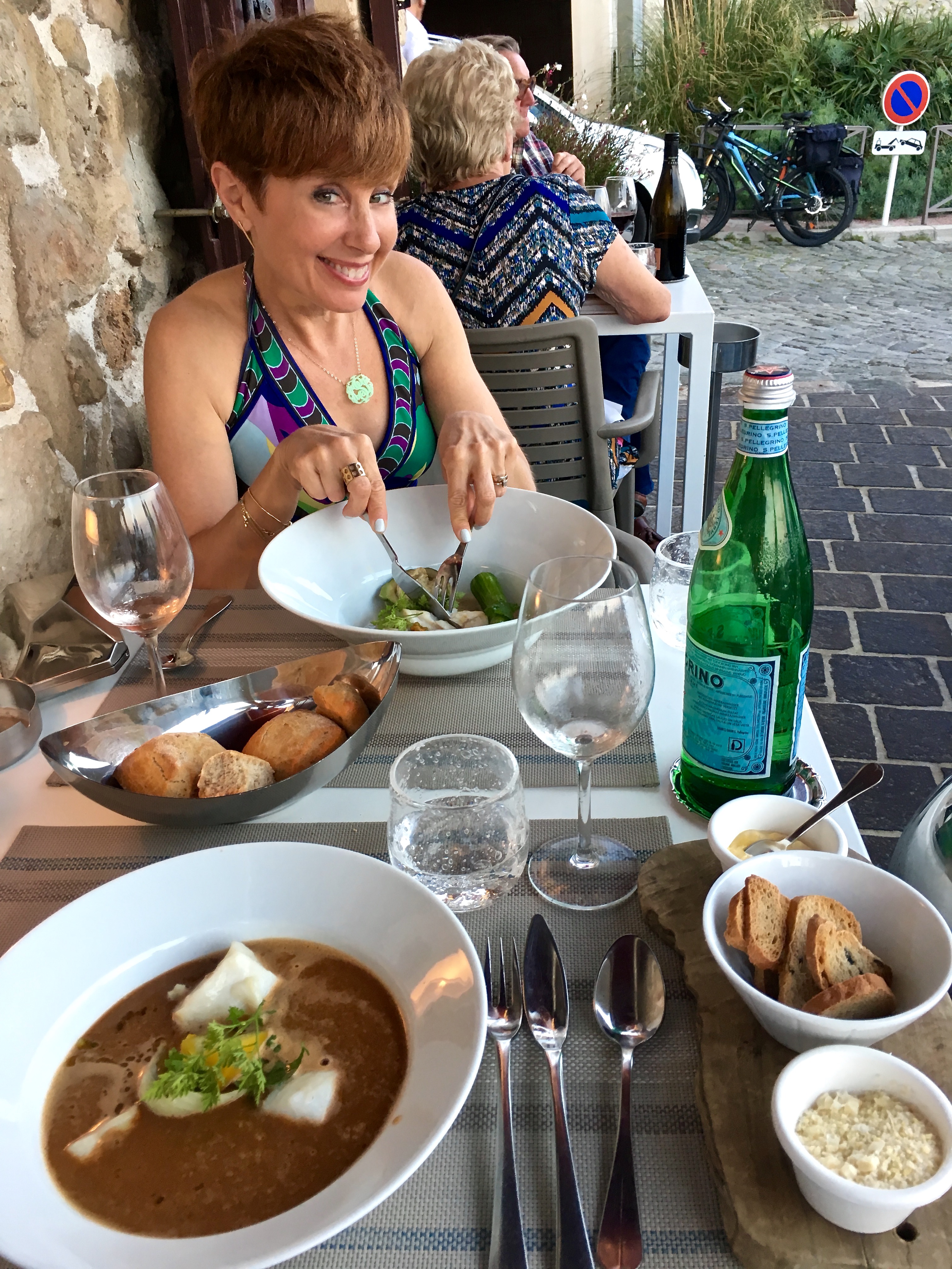 IMG_7502 October 30, 2018 3024 × 4032 Ancient Antibes You can see our terrace-side seating and my excitement over my meal. Matthew’s having the bouillabaisse.