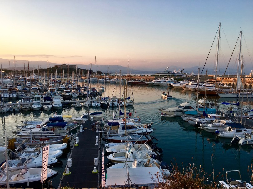 IMG_7865 October 30, 2018 4032 × 3024 Ancient Antibes A view of the Old Port at sunset shows the variety of fishing boats owned by regular folk, some of which are for rent or offer tours of the coastline.