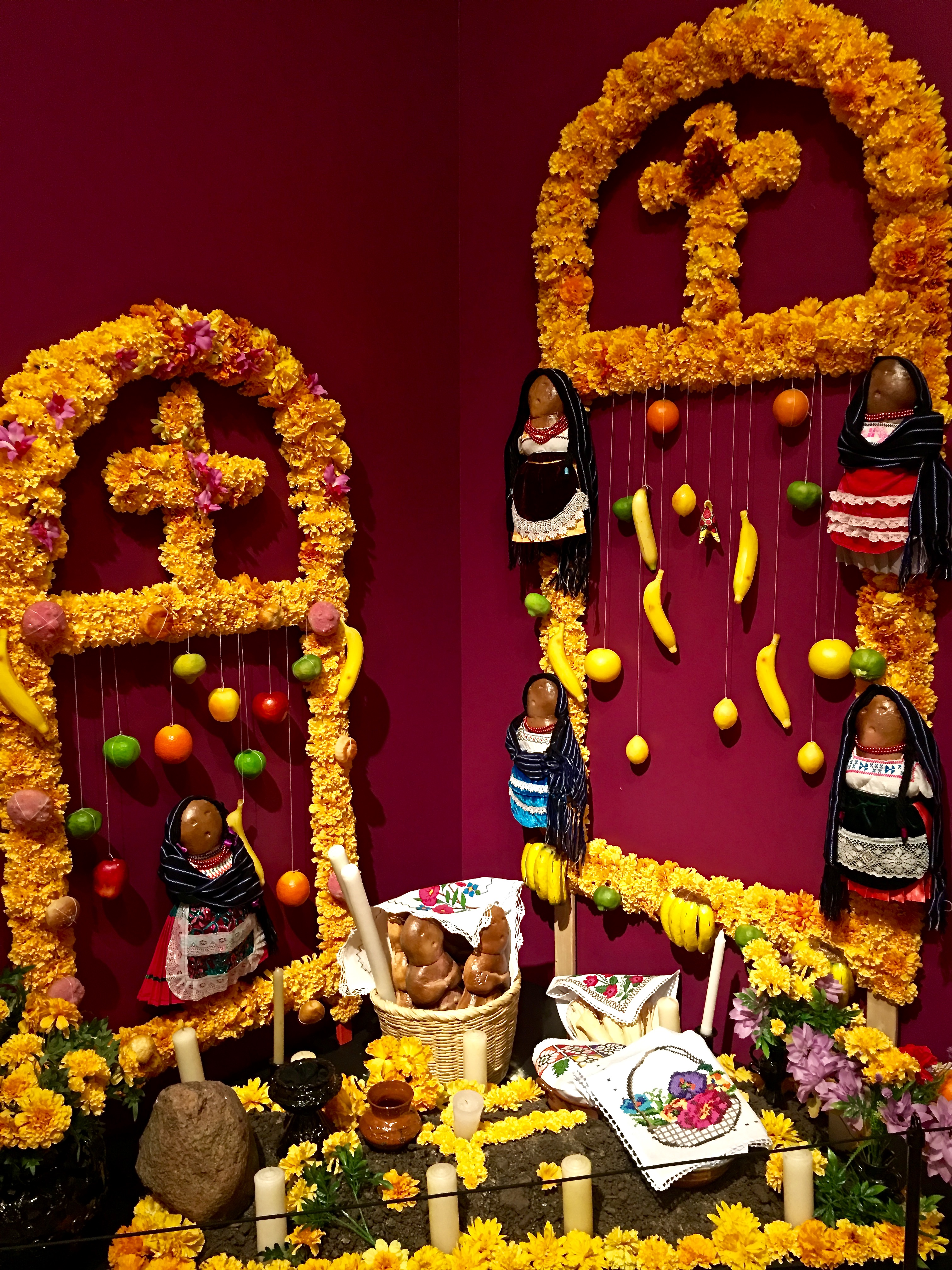 Pictured is an ofrenda typical of people from Carapan. Men make the archway, and women decorate it with Cempasúchil, the Mexican marigold. The scent and vivid color of this flower is said to help lure the dead closer to their families. You’ll can also see the corpse-shaped Pan de Muerto (“Bread of the Dead”) used to feed the spirits. Candles and incense are also key in creating the right atmosphere for the return of the dead.