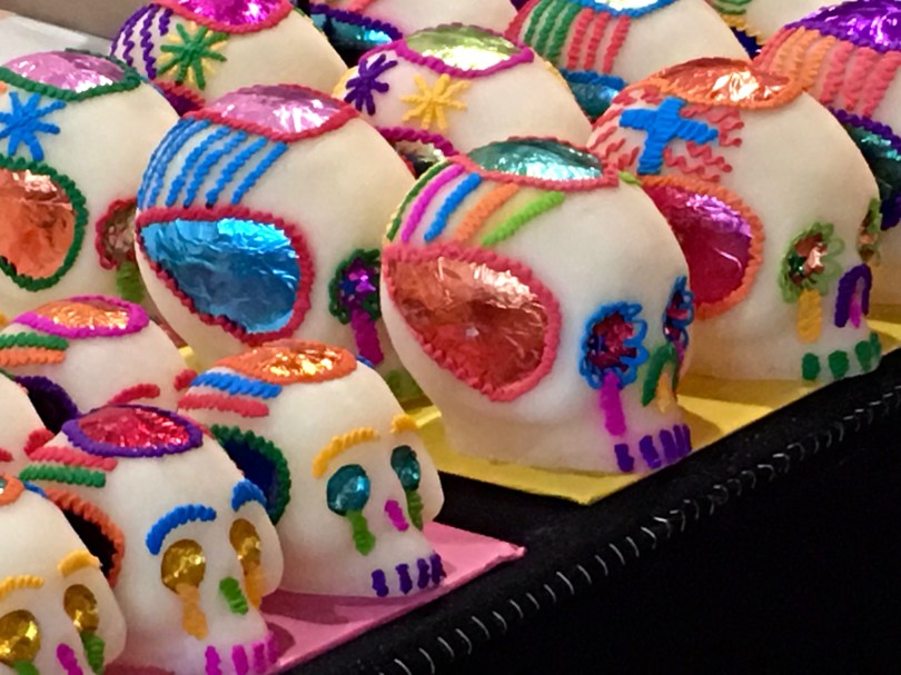 “Calaveras de azucar” (skulls made of sugar) are not only colorful works of art, but they’re intrinsic to the Day of the Dead celebrations. Family members have the artist right the name of the deceased on the forehead of the skull, then place it on an altar honoring the departed.