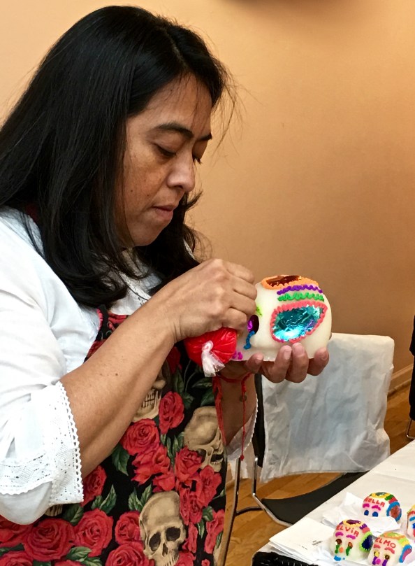 IMG_0435 November 9, 2018 2848 × 3881 Halloween in Oslo & Chicago Here, the artist uses icing to paint a name on the forehead of a calaveras purchased by a friend of mine. She wanted to honor her recently departed dad by creating her own ofrenda at home.