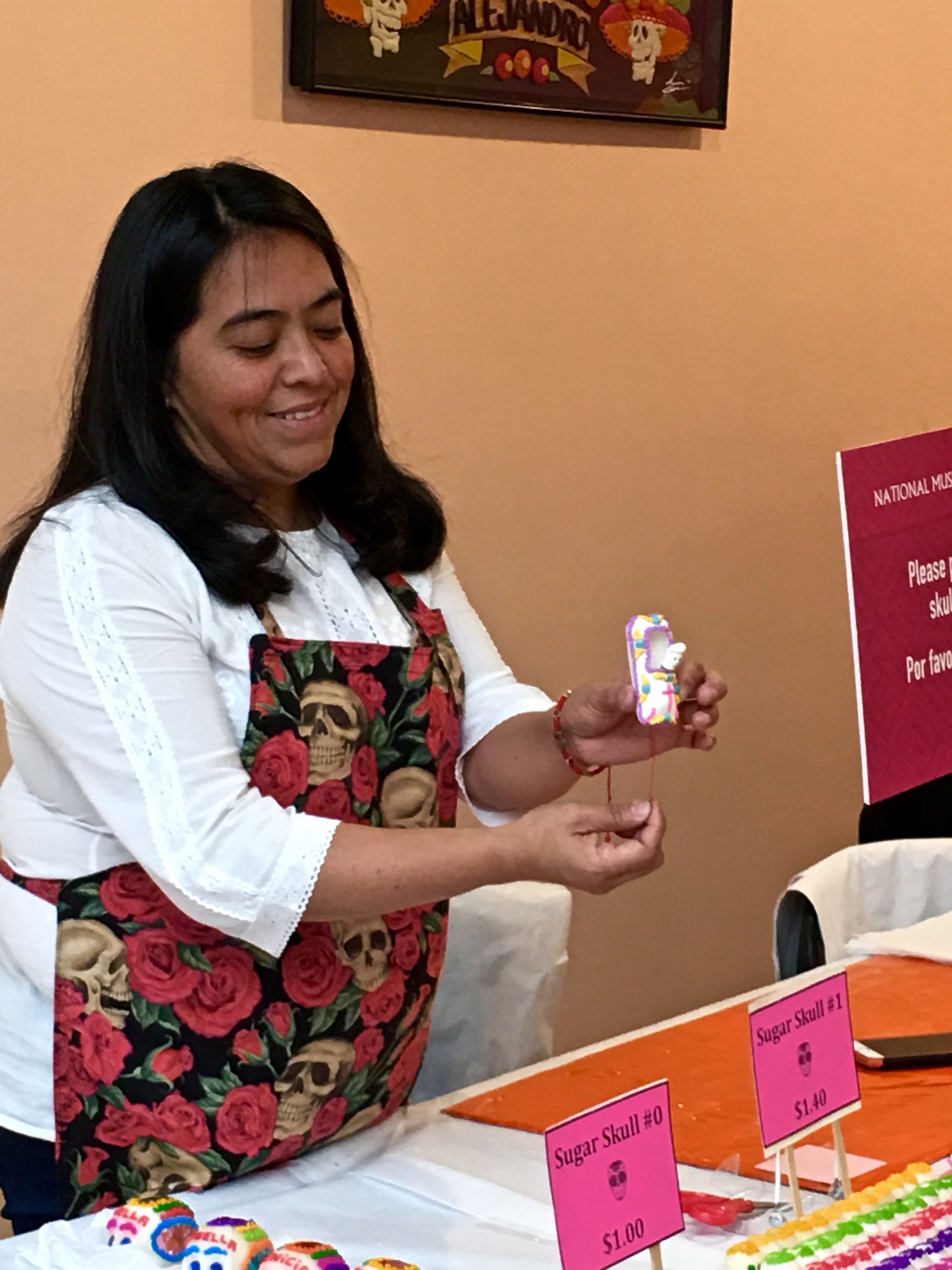 IMG_0440 November 9, 2018 3024 × 4032 Halloween in Oslo & Chicago A member of the Mondragon family demonstrates another kind of alfeñique, a coffin with a little skeleton that pops forward when you pull the string.