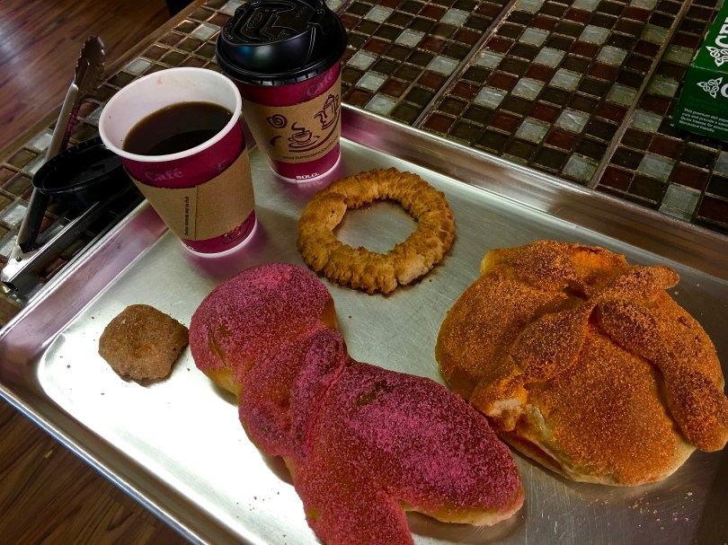 IMG_0453 November 9, 2018 4032 × 3024 Halloween in Oslo & Chicago Pictured is my selection of Pan de Muerto (Bread of the Dead), plus the fabulous coffee. You can see the bread comes shaped like a little corpse, or like a bun with crossbones on it.