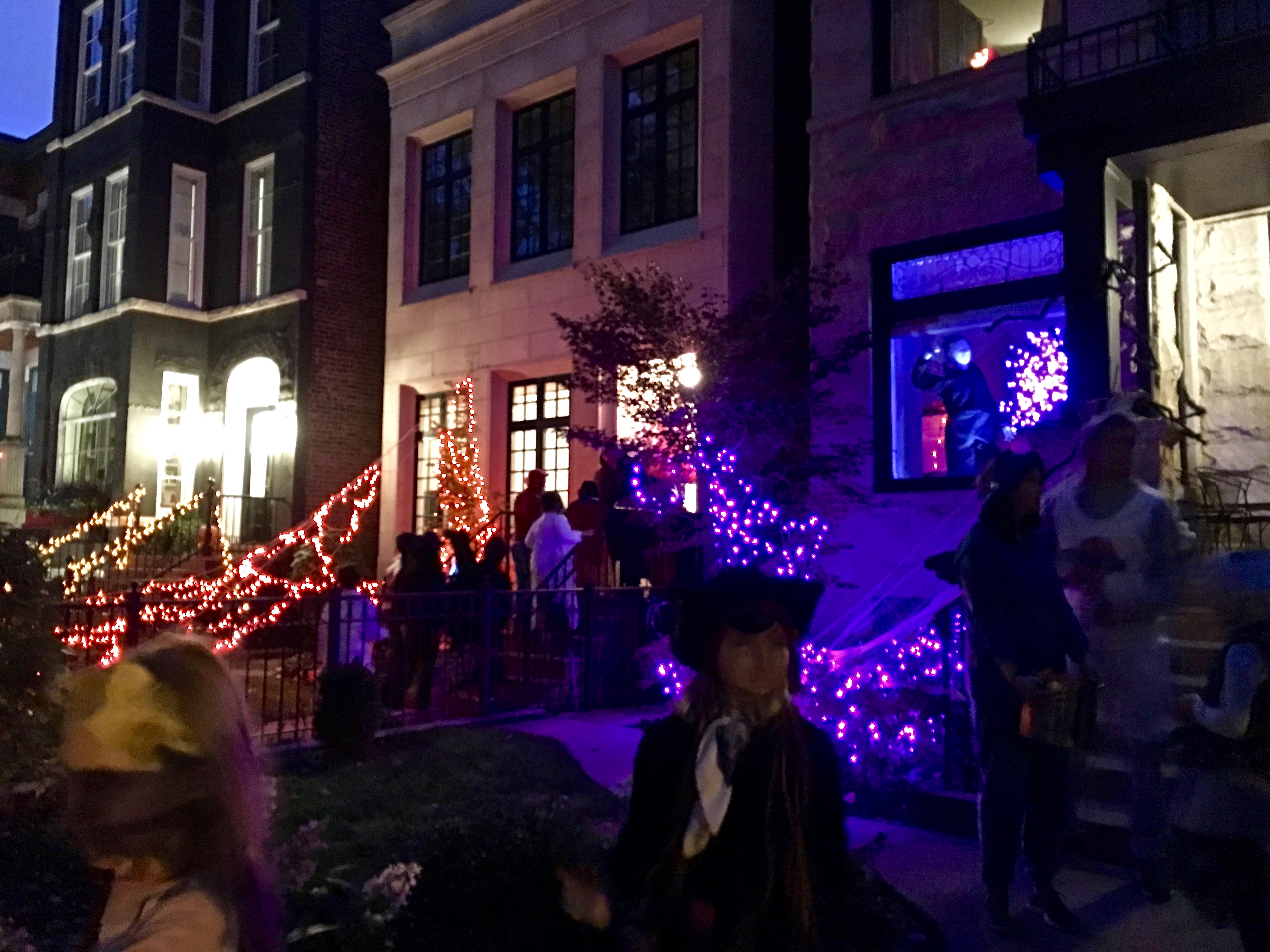 Purple lights are the latest fashion, but look closely in the big picture window on the right. This family has created a tableau with “Michael Meyers” from the original Halloween movie. He’s got his hockey face-mask and raised knife. Very approachable.