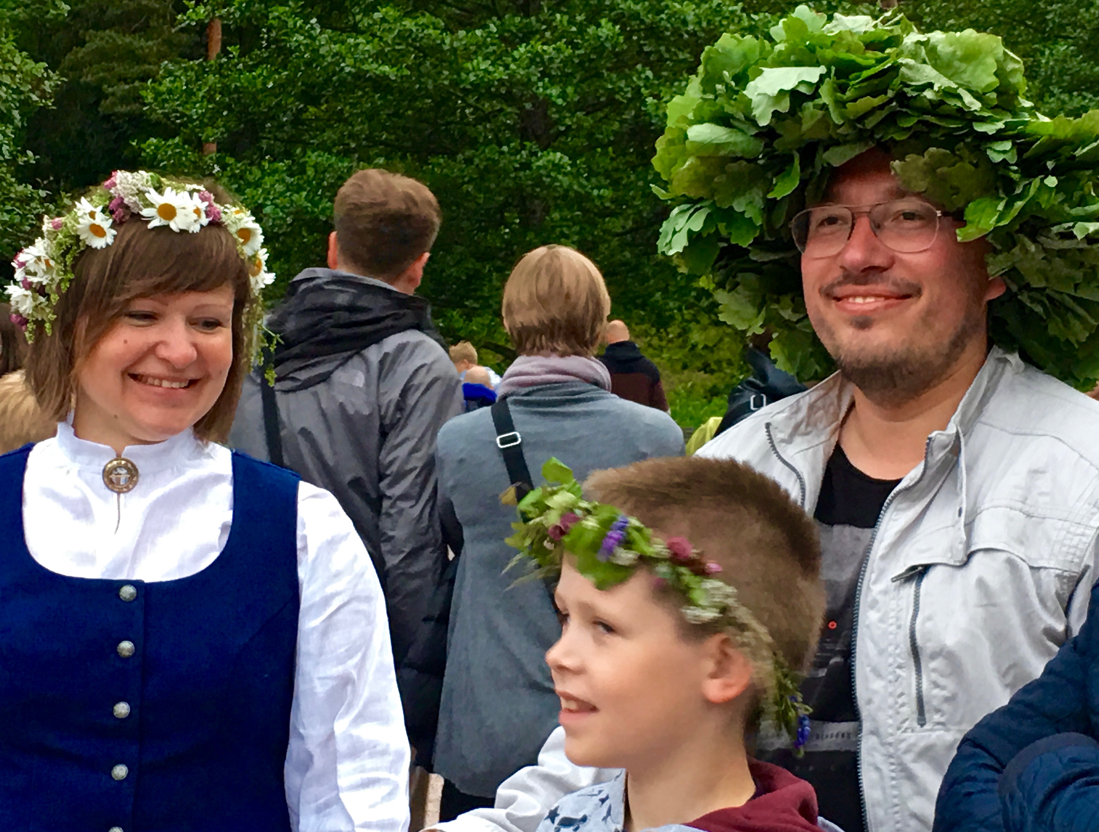 For the men, oak-leafed warbonnets represent the “Oak King,” sometimes called the “Green Man.” He symbolizes rebirth, new growth, and the circle of life in the spring and summer. The saying goes that the Oak King, who brings the light, is strongest at the summer solstice. But he’s eventually defeated by the darkness of the Holly King, who’s strongest at the winter solstice. And this epic battle plays out every year.