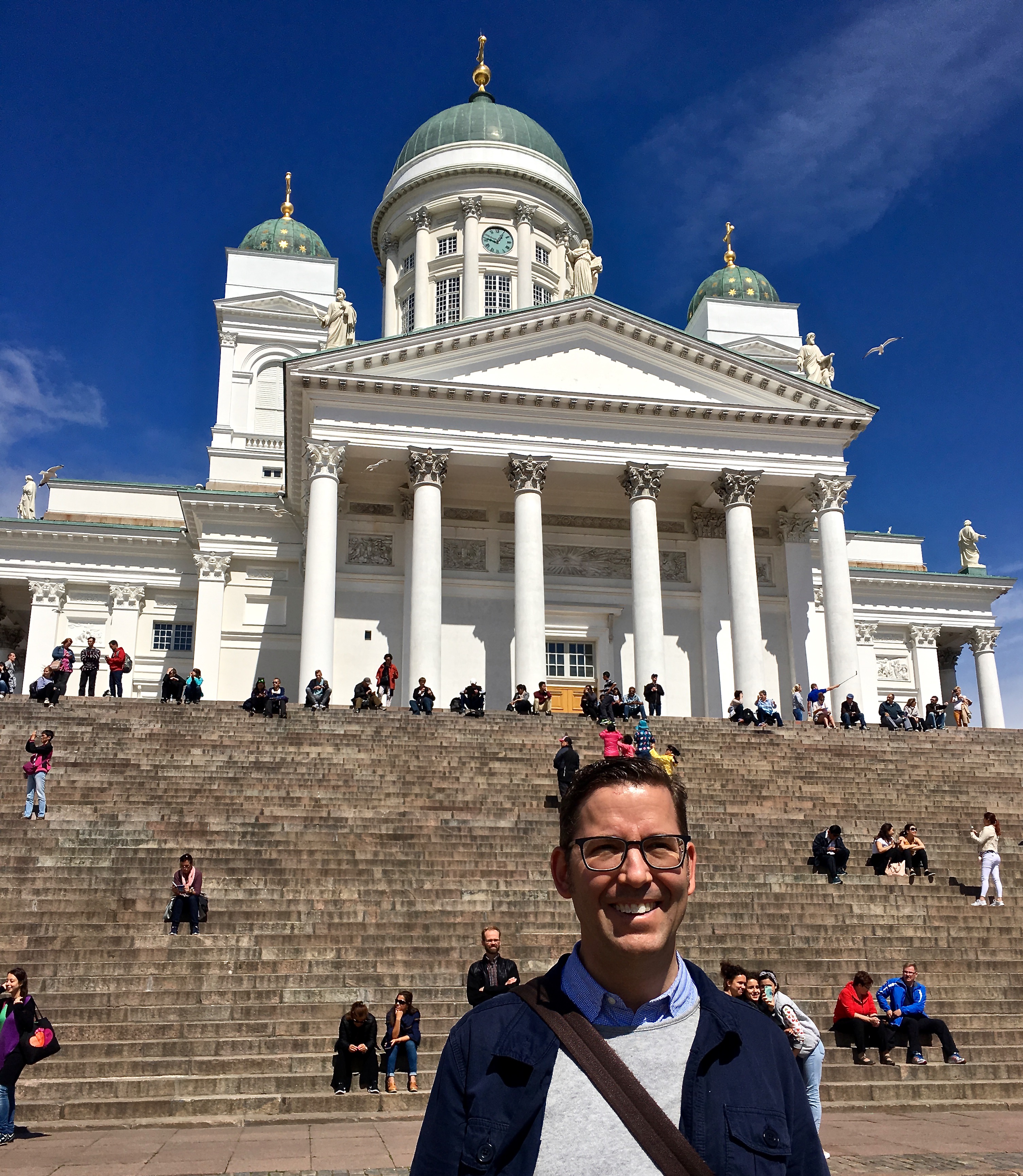 Matthew’s standing in front of “Helsingin tuomiokirkko” — Helsinki’s Lutheran Cathedral. Yes, most Finns are Lutheran. Engel designed it (1830-1852) as a tribute to Czar Nicholas I. Intended as the cherry on Engel’s Neoclassical Senate Square cake, the edifice commands a platform that overlooks the other plaza buildings. I love this pic because it communicates that issue of scale I’ve been talking about. Look closely, and you’ll see that, like Gulliver, Matthew has Lilliputians crawling all over him.